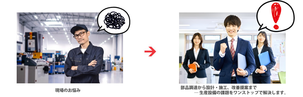 当社は、生産設備に関する修理から改善提案までワンストップで対応いたします。部品調達・設計・施工を一貫して行い、協力業者との連携により柔軟な日程調整も可能です。
